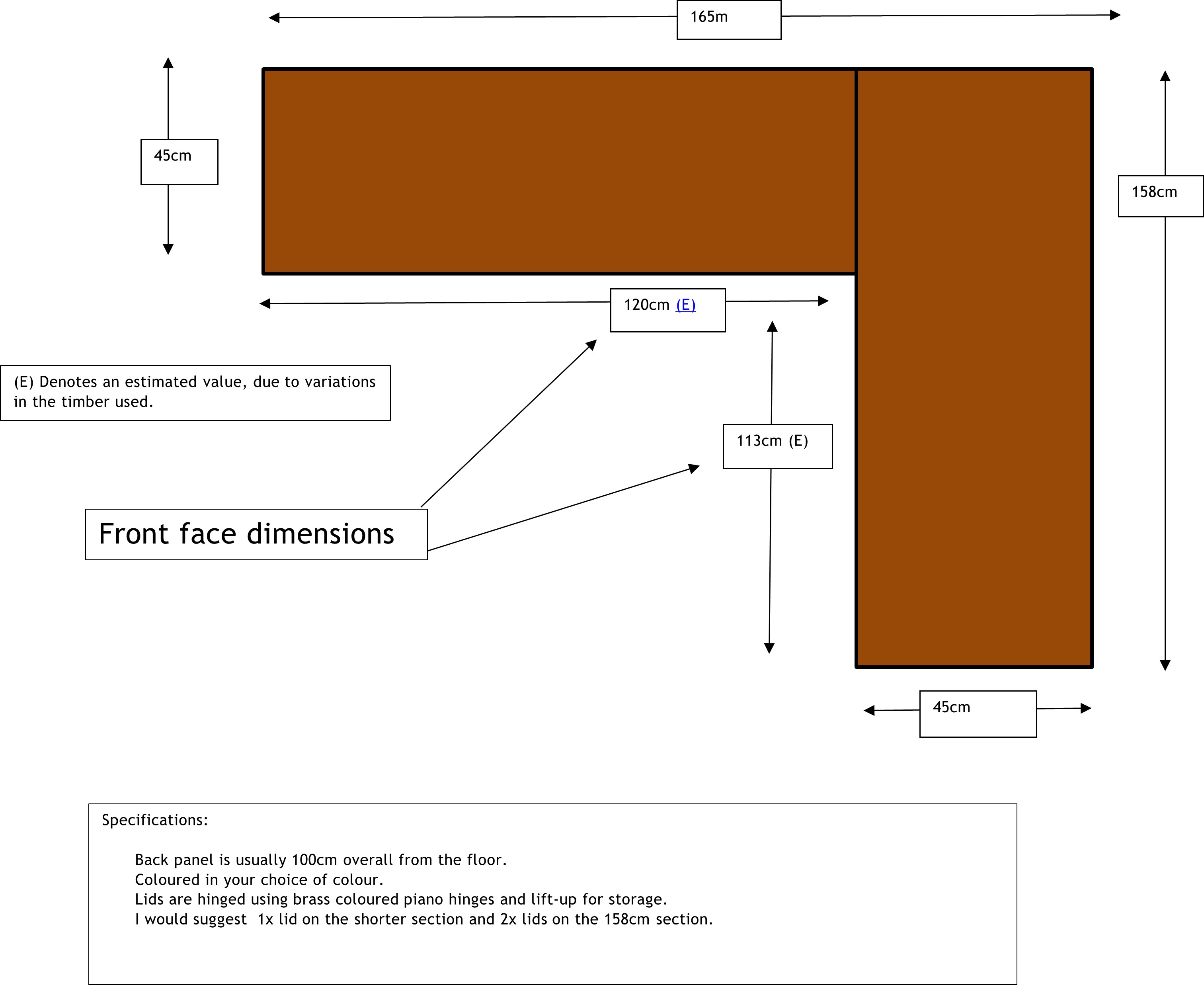 165cm x 158cm long x 100cm high x 45cm deep